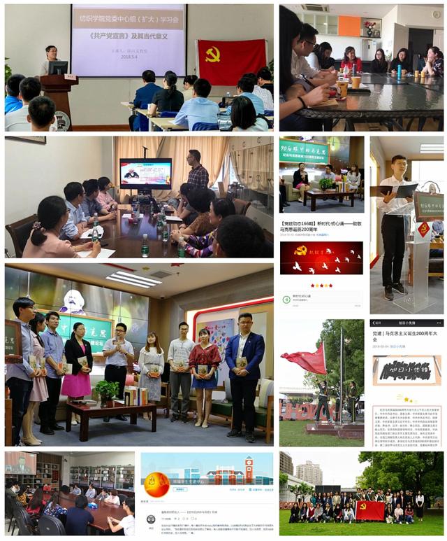 计算机学院党委结合学校目前开展的“不忘初心、牢记使命,贯彻落实党的十九大精神”学习实践活动,召开专题组织生活会,组织党员观看纪录片《不朽的马克思》,并以《启航新征程,争做新标杆》为主题开展征文活动,抒发对马克思主义思想领航青年奋斗之路的敬仰,坚定青年继续开拓创新、追求卓越的信念;机械学院党委组织开展“致敬马克思诞辰200周年”线上互动与线下实践的纪念活动,受到师生广泛关注和积极响应;环境学院党委依托“党漾青春”公众号、学院媒体等播放连载《给90后讲讲马克思》及《今日再谈马克思》微党课,并将师生观看心得通过易班“党建中心”发布交流;管理学院党委也陆续通过易班、公众号、微课工作室等媒介传承和弘扬马克思主义伟大思想,不受环境制约的“随身小课堂”得到青年学生的普遍欢迎和喜爱。