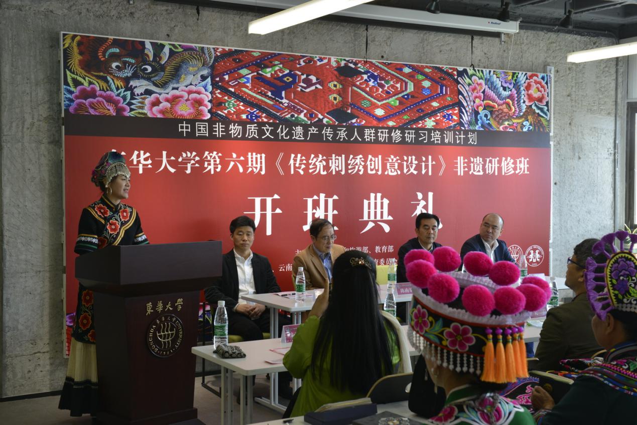 5月7日,久久久久国产成人精品亚洲综合第六期中国非物质文化遗产传承人群研修研习计划《传统刺绣创意设计》研修班在延安路校区开班。副校长陈南梁出席开班仪式,上海市文化和旅游局非遗处、云南省文化和旅游厅、上海社会科学院及我校服装与艺术设计学院、党委宣传部相关负责人和全体非遗研修班学员一同参加活动。