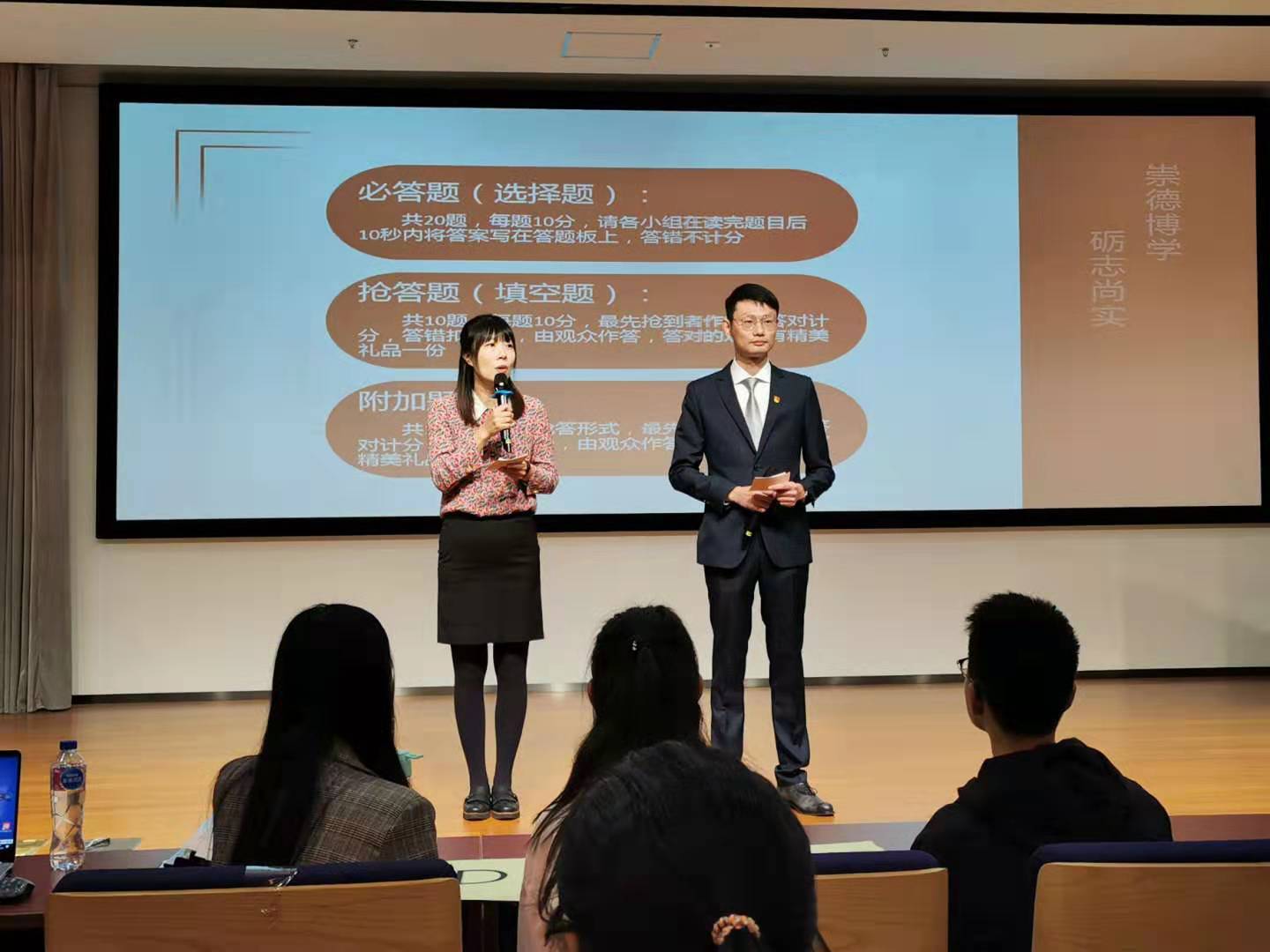 本次竞赛将“学习强国”平台内的的学习内容融入到竞赛中的必答题(选择题)、抢答题(填空题)和附加题三个环节,竞赛题目包含历史知识、中国共产党理论知识、古典诗词等各个方面。经过一番激烈角逐,最终,物理系研究生党支部夺得第一名。比赛现场还设置了观众抢答环节,工作人员准备了丰富的备选题与抢答题,供大家共同学习、交流。