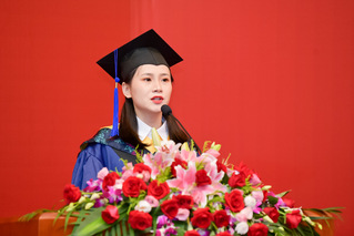 毕业生代表、化工生物学院2020届硕士毕业生聂子琪感恩母校和老师们的精心培养,感谢同窗契友的陪伴。她说,在东华的这些年,身心得到了成长,能力得到了锻炼,视野和境界得到了拓展,一定会带着“崇德博学、砺志尚实”的精神,在工作岗位上为母校增光添彩。在校生代表、环境学院2017级本科生姚强回忆了和学姐学长们一起度过的难忘时光。他说,“东华见证着我们的日益成长,你们也成为了我们的榜样。”祝福毕业生们有念想、有追求,披荆斩棘,“大有前程可奔赴,乘风破浪立潮头”。