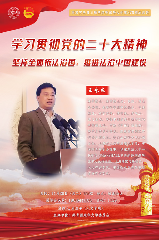 全面依法治国是国家治理的一场深刻革命,关系党执政兴国,关系人民幸福安康,关系党和国家长治久安。法治思维是推进党和国家各项事业发展的科学思想方法,也是大学生成长成才必备的基本思维素养。在第九个国家宪法日到来之际,讲座以“法治”为视角,结合党的二十大报告,主要提纲为:一、党的二十大的背景、成就与核心要义;二、党的二十大关于加快建设法治社会的主要内容;三、全面加快建设法治社会的思考建议。讲座将聚焦法治思维的内涵、价值与特征,为当代大学生掌握法治思维提供路径建议和指导。